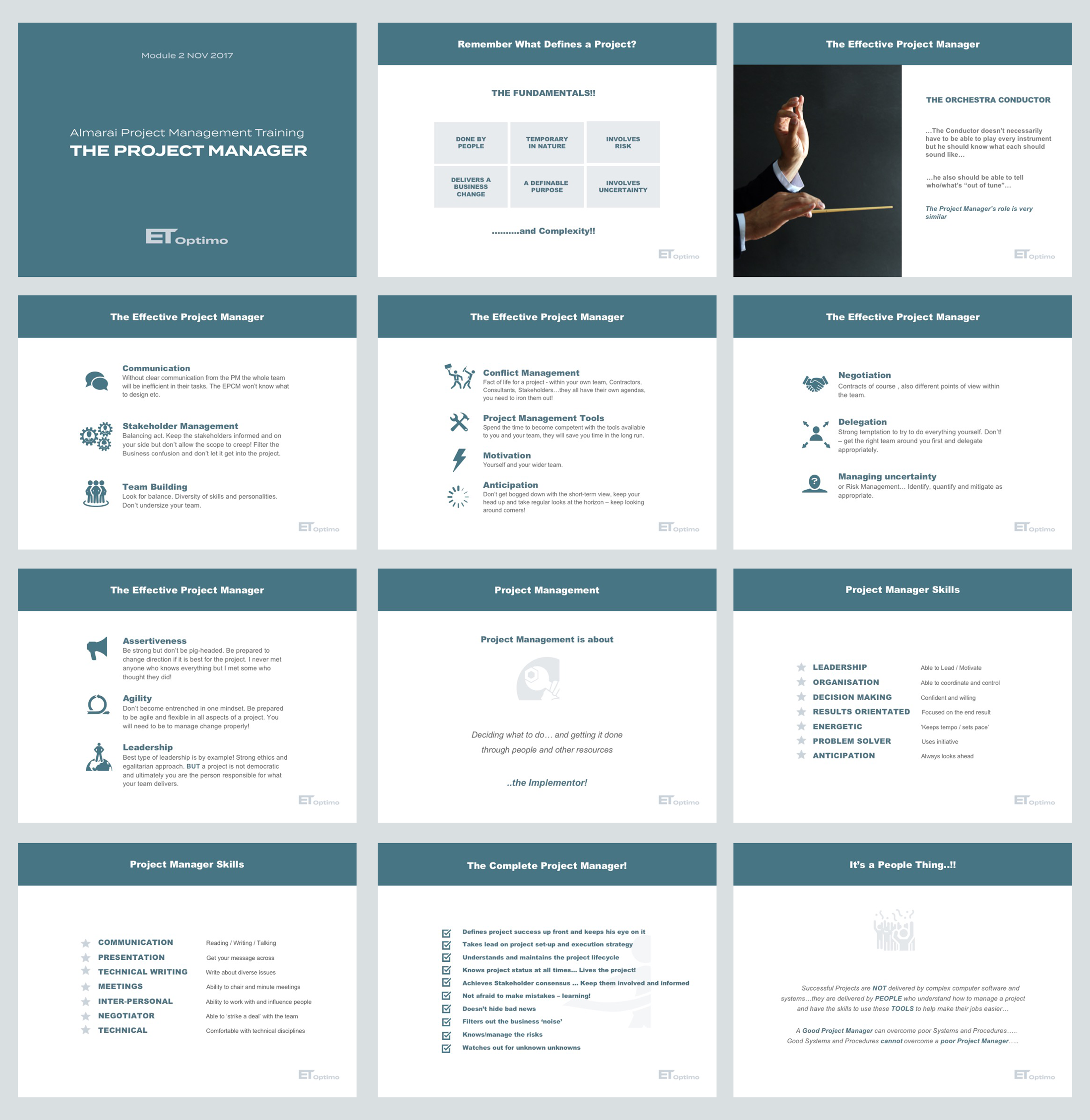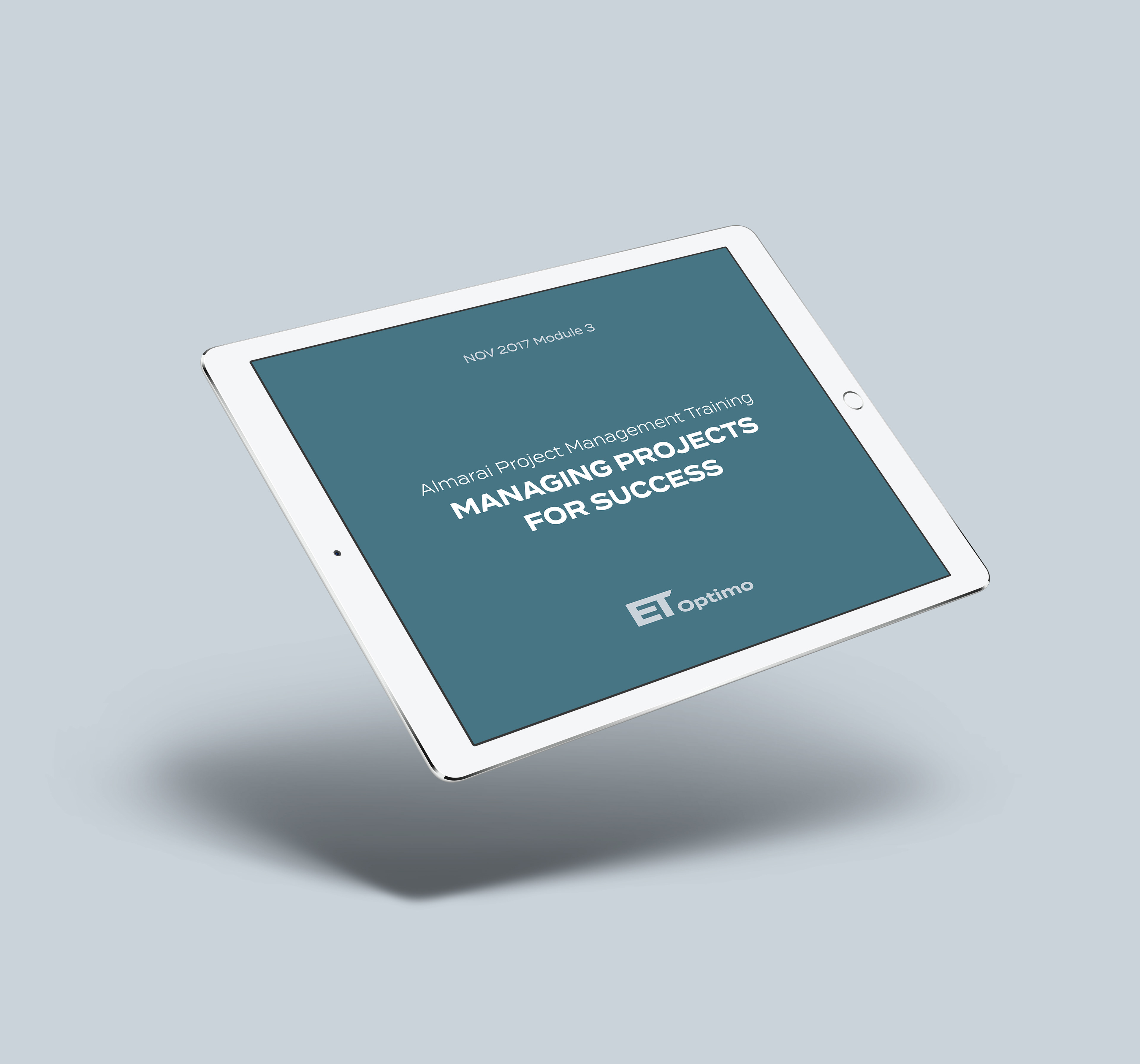 Identity designed for ET Optimo, an international engineering and project management consultant. A series of Powerpoint Presentations were produced as part of an ongoing Management Training Course for Alamai.